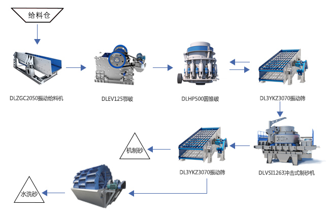 河卵石硬度較高,破碎環(huán)節(jié)可以選用鄂破+圓錐破兩段破碎工藝,制砂環(huán)節(jié)可用2臺沖擊式制砂機,工藝流程為:河卵石原料經(jīng)振動給料機均勻輸送給顎式破碎機進行粗碎,粗碎后的物料直接輸送到圓錐破進行中碎,中碎后的物料再被輸送到2臺沖擊式制砂機進行制砂。