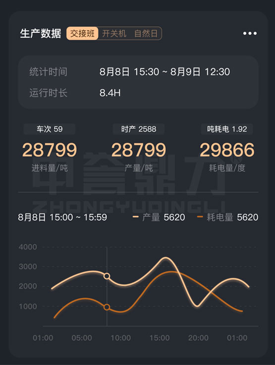 礦山管家APP可查看各類生產數據,交接班(廠內的上下班時間)、開關機(班次的開始結束時間)、自然日(0~24點) 進料量(數據來自進料系統)、產量(數據來自皮帶秤)、耗電量(數據來自智能電表、能耗系數轉換) 產量耗電量趨勢對比曲線等。