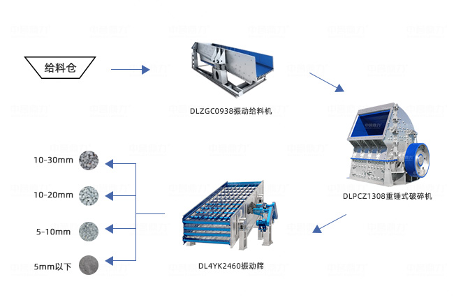 • 主要設(shè)備:振動給料機、重錘式破碎機、顎式破碎機、反擊破碎機、振動篩