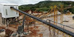 石頭原料使用振動給料機設備輸送至破碎機進行破碎處理,大型破碎機設備可以將大塊的石頭破碎成較小的物料,破碎后的石料再經過振動篩進行篩分選級,篩選出符合規格尺寸的石料,由成品輸送帶送至成品料區,不符合規格的石料由返料皮帶返回至破碎機再次進行破碎。根據生產需求破碎篩分后的一部分石料需要進行制砂處理,使用制砂機設備將物料進行細碎、整形破碎,加工成符合規格的砂子料。一般產線為提高砂料的品質,還會配置洗砂機對砂子進行清洗,提高其質量,然后由成品輸送帶送至成品料倉。