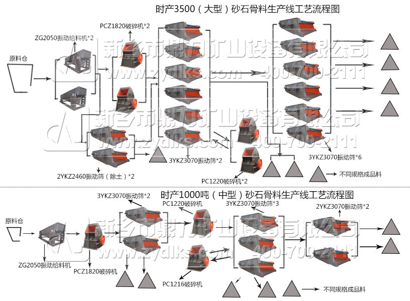 1000噸石料生產線則是有一臺振動給料機均勻給料,進入破碎設備進行物料破碎,破碎物料接著進入振動篩進行篩分,不滿足粒度物料直接進入下破碎設備進行再次破碎。可以根據成品料顆粒粒度的需求增加破碎設備和篩網不同孔徑的振動篩進行砂石生產線砂石物料的生產。可以看出此條生產線生產物料為顆粒比較細小砂石料。