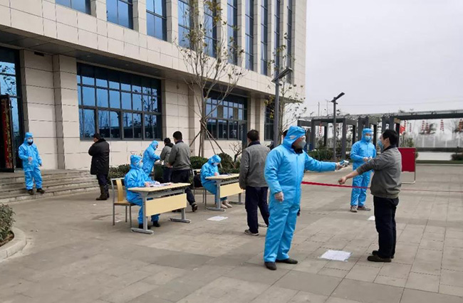 王生群一行來到中譽鼎力廠區(qū)內(nèi)部,詳細了解了公司的值班記錄、體溫測量、人員登記、食堂就餐等情況,認真檢查疫情防控各項措施是否落地、落細、落實。