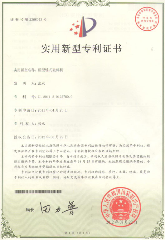在公司高層導的英明決策和體員工的共同努力下,河南省新鄉鼎力礦山機械設備有限公司積向家知識產權總局申請的自主研發的“錘式破碎機”新,順利通過相關部門的驗收,獲得此項的證書。這將成為內礦山機械行業新的里程碑,預示著智能化、化的礦山開采時代已經來臨。