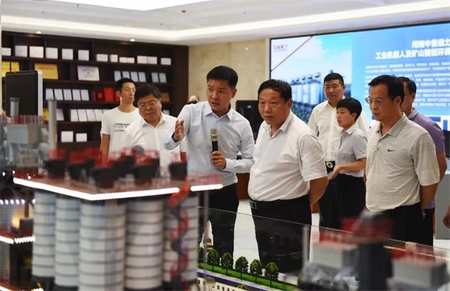 7月25日下午,新鄉市委副書記、市長王登喜帶市市直局委、縣級導干部蒞臨中譽鼎力調研,衛輝市市長范士富及衛輝市環保局、科工信局、發改委等相關部門負責人隨同觀摩。河南中譽鼎力智能裝備有限公司董事長張治民、副總經理原文秋等人現場接待,并匯報公司各項情況。