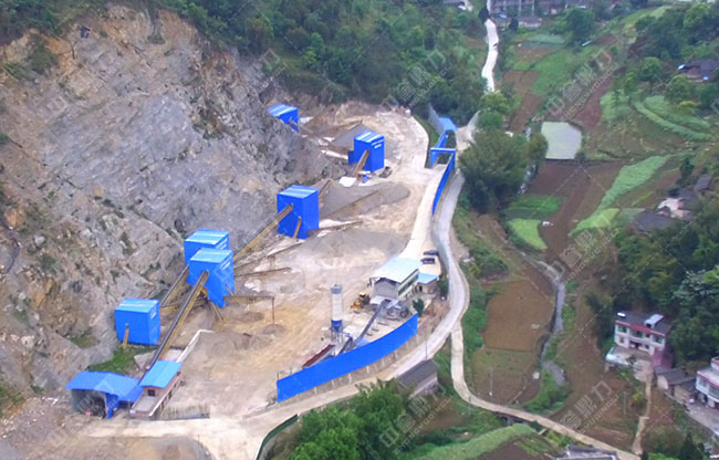 破碎工藝:圓錐磕石機+制砂機+震動喂料機+圓石子篩+輸送系統+選粉設備