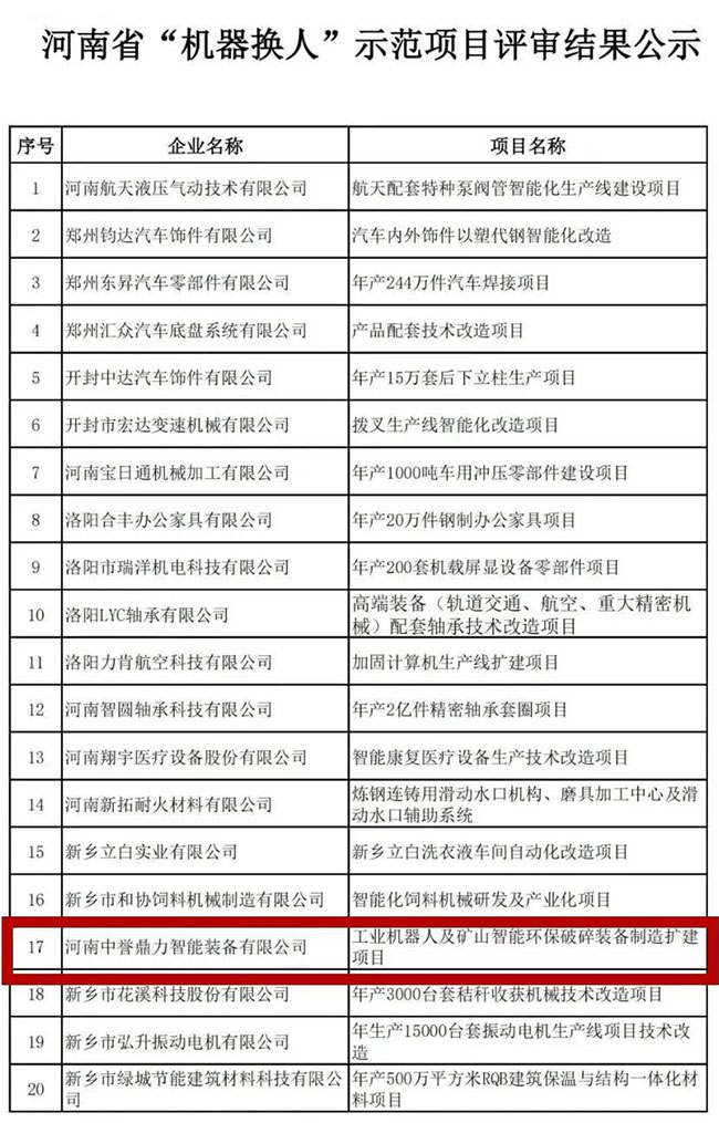 其中,河南中譽(yù)鼎力智能裝備有限公司工業(yè)機(jī)器人及礦山智能環(huán)保破碎裝備制造擴(kuò)建項目成功通過評審。