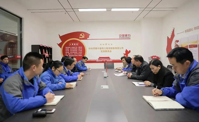 中譽(yù)鼎力黨建指導(dǎo)員王士存,新鄉(xiāng)市中譽(yù)鼎力軟件科技股份有限公司總經(jīng)理楊乾,河南中譽(yù)鼎力智能裝備有限公司行政副總經(jīng)理崔玉清、營銷副總經(jīng)理王春燕、生產(chǎn)副總經(jīng)理李、黨支部書記、企管部長吳澤朋及各部門20余位黨員代表參加會議。
