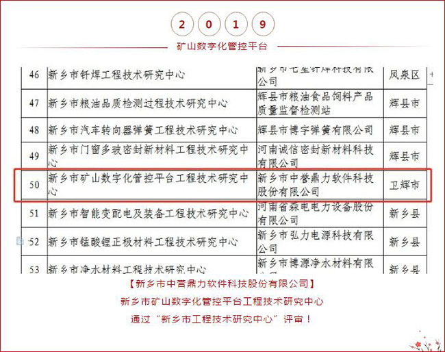 根據(jù)《新鄉(xiāng)市市級工程技術(shù)研究中心管理暫行辦法》(新科計〔2016〕33號)的有關(guān)規(guī)定,市科技局組織對申報的新鄉(xiāng)市工程技術(shù)研究中心開展了會議評審和現(xiàn)場審核。日前,經(jīng)局長辦公會研究決定,及為期7天的公示,認(rèn)定86家工程技術(shù)研究中心為2020年度新鄉(xiāng)市工程技術(shù)研究中心。河南中譽(yù)鼎力智能裝備有限公司建設(shè)的“新鄉(xiāng)市智能礦山裝備工程技術(shù)研究中心”入選!這也是中譽(yù)鼎力次進(jìn)入新鄉(xiāng)市工程技術(shù)研究中心名單!