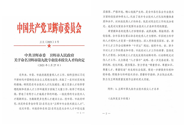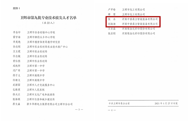 2021年1月27日,衛(wèi)輝市委、市發(fā)布《關(guān)于命名衛(wèi)輝市第九批技術(shù)拔尖人才的決定》。中譽(yù)鼎力董事長張永、河南中譽(yù)鼎力智能裝備有限公司技術(shù)中心部長劉海淘被任命為“衛(wèi)輝市技術(shù)拔尖人才”!