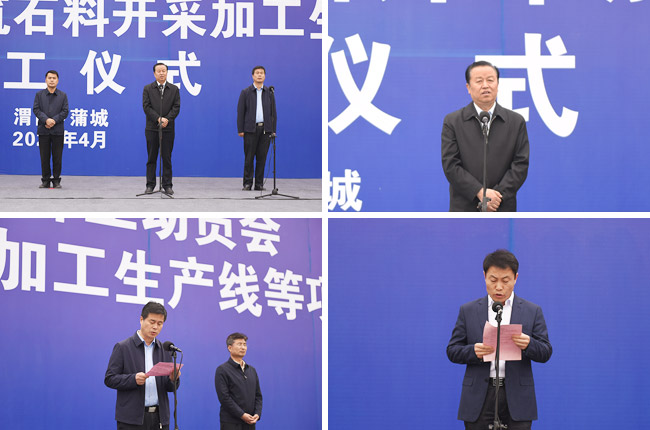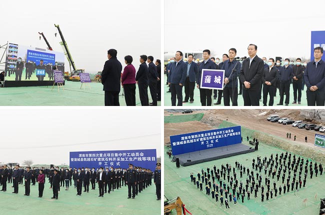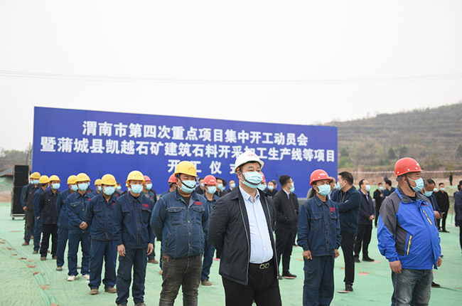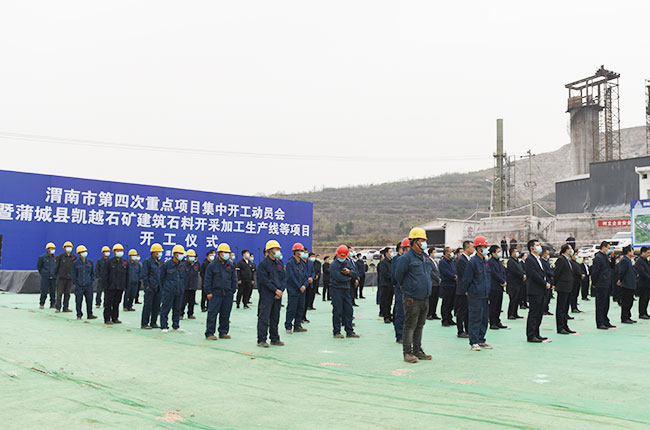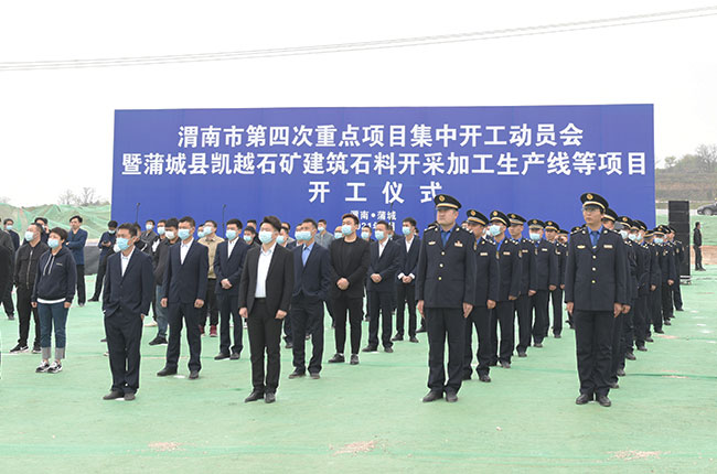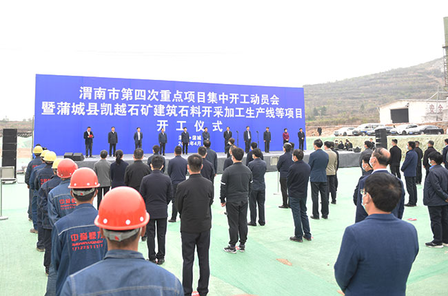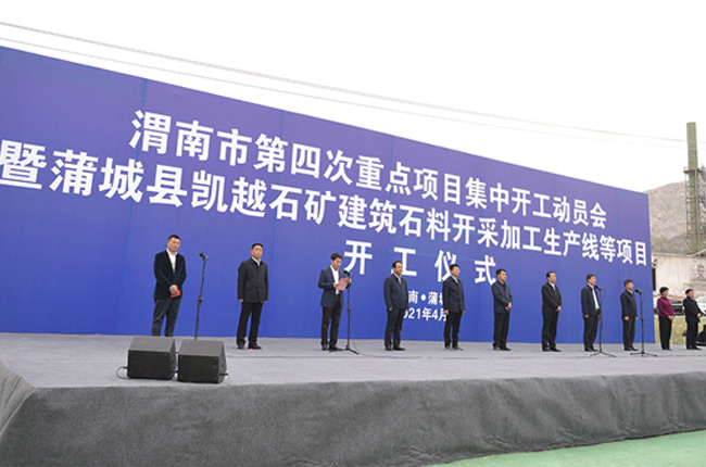 4月15日,陜西省渭南市蒲城縣舉行渭南市第四次項目集中開工動員會暨蒲城縣凱越石礦建筑石料開采加工生產線等項目開工儀式。渭南市委常委、副市長劉凱,渭南市人大常委會副主任、蒲城縣委書記陳振江等導,凱越石礦有限公司總經理楊斌出席儀式。