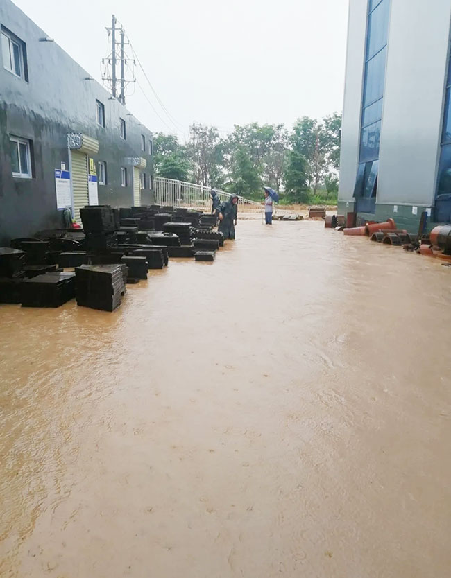 廠區降水同樣嚴重,在崗的鼎力人已盡力守住車間倉庫