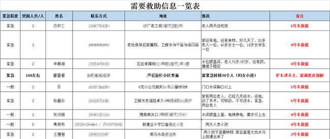 自7月23日早上起,在中譽鼎力董事長張治民、總經理楊乾,藍天環保副董事長趙銳、總經理耿強、銷售總監朱濤等導的指揮下,公司行政部門開始統計大家在社交平臺上收集的受災群眾信息。