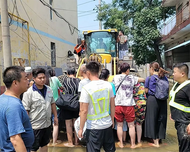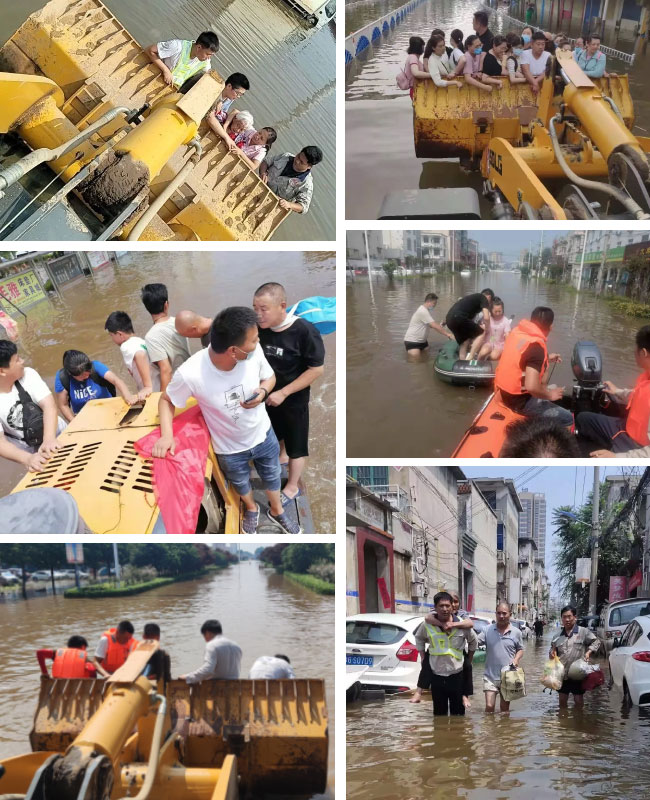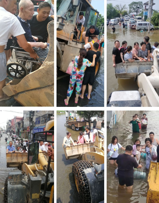 企管部長吳澤朋組織中譽鼎力抗洪救援隊迅速集合出發,駕駛機械車輛、救援鏟車,攜帶皮劃艇、防汛砂等救援器材和方便面、飲用水等救災物資,趕赴受災群眾家中,與救援團隊一起并肩作戰,進行緊急救援。