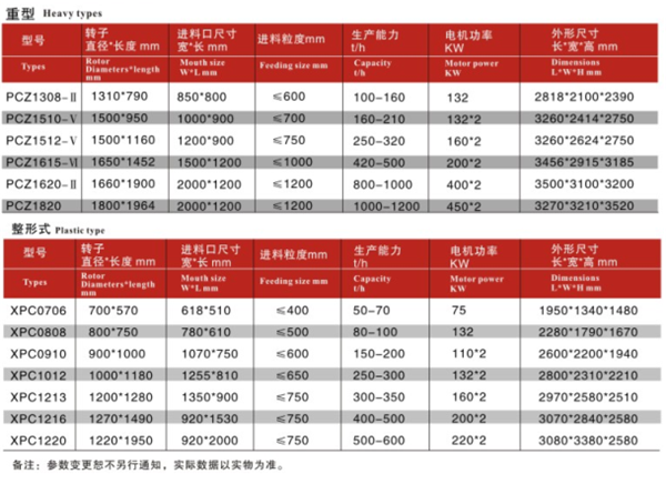 新鄉鼎力生產的pc破碎機系列采用蝸牛式上下機殼組裝結構,破碎腔闊而深,整個破碎過程無死角,結構設計合理,進入破碎腔內的物料自上而下地經歷先粗破,再中破,后細破的破碎工藝過程,實現了在一個機體內同時多級連續破碎的工藝,不僅增大了破碎比,還減少了各種破碎設備和輔助設備的數量,縮小占用空間,能耗,減少投資和維護費用,可為客戶節省大量生產成本。客戶可根據下圖pcz重型錘式破碎機和xpc整形錘式破碎機的具體技術參數來參考并選購適合自己的設備類型。