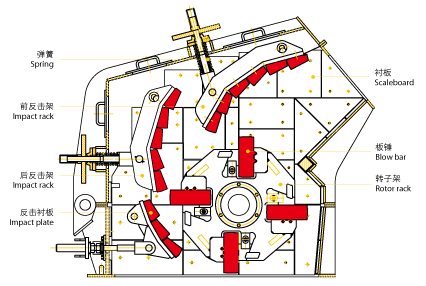 錘破:經(jīng)給料機(jī)進(jìn)入破碎機(jī)進(jìn)料口的礦料,在高速旋轉(zhuǎn)的錘頭的作用下被次破碎,之后反彈,又以高速撞擊在反擊板上進(jìn)一步被破碎,在整個(gè)過(guò)程中,礦石受到多次破碎,破碎合格的礦料經(jīng)過(guò)篩條裝置排出,不合格的礦料繼續(xù)留在破碎腔破碎,大塊石料在破碎腔內(nèi)受到多次破碎,合格的礦料被及時(shí)排出,不會(huì)出現(xiàn)過(guò)粉碎現(xiàn)象。