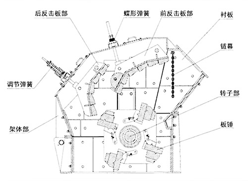 DLHCS反擊式破碎機主要運用沖擊能的破碎原理,轉(zhuǎn)子在電機帶動下高速旋轉(zhuǎn),物料進入機腔后落入板錘工作區(qū),板錘在轉(zhuǎn)子的帶動下飛速旋轉(zhuǎn),撞擊物料破碎,而后物料又被拋向機腔內(nèi)壁的反擊襯板,后被反彈到板錘,與此同時,物料在機腔內(nèi)互相碰撞,經(jīng)多次破碎后達到成品料要求的物料從出料口排出。