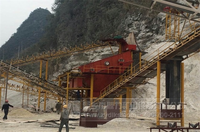 上圖為時產800噸碎石生產線的生產現場,依托山勢將山石進行破碎,不僅利用了當地的資源,而且減少了物料輸送過程中的能源消耗,生產效率大大提高。