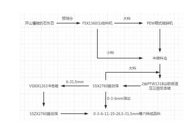 主機設備:PEW顎式破碎機、2臺PFW反擊破碎機、VSI6X制砂機