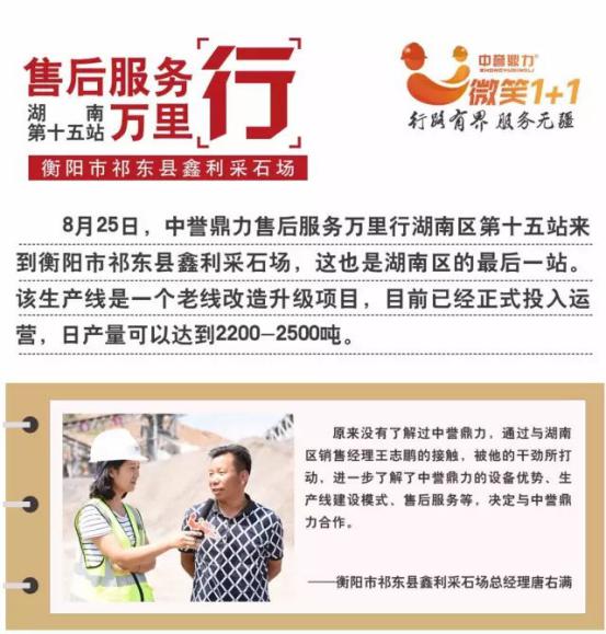 8月25日,中譽鼎力售后服務萬里行湖南區第十五站來到衡陽市祁東縣鑫利采石場,這也是湖南區的后一站。該生產線是一個老線改造升級項目,目前已經正式投入運營,日產量可以達到2200-2500噸。