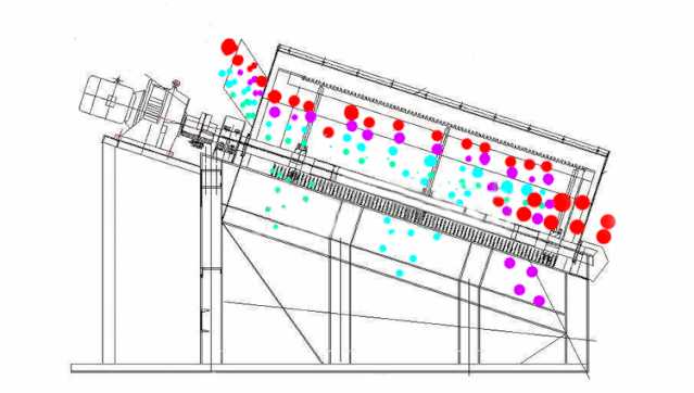 利用振動電機激振作為振動源,使物料在篩網上被拋起,同時向前作直線運動,物料從給料機均勻地進入篩分機的進料口,通過多層篩網產生數種規格的篩上物、篩下物,分別從各自的出口排出。