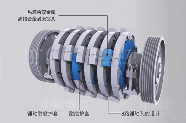 出料口采用無篦條設計,滿足出料粒度要求的直接排出,減少了物料在機腔內的停留時間,對錘頭等配件的磨損較小;采用熱復合雙金屬,高鉻合金耐磨錘頭,使用壽命比普通錘頭提高至少15%;轉子外圍加裝耐磨護圈,避免物料與轉子本身的直接碰撞,增加轉子使用時間;